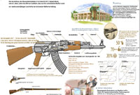 ihm entwickelte Sturmgewehr — die berühmte AK-47 (AK steht für „Awtomat Kalaschnikow") — wurde faktisch mit Beginn der Fertigung im Jahr 1949 zu einer Legende. Kalaschnikow verfügt über 35 Patente auf dem Gebiet der Handfeuerwaffen; in seinem „Portfolio" gibt es sowohl Maschinengewehre als auch Jagdkarabiner. Doch Berühmtheit erlangten der Konstrukteur, die Stadt Ischewsk und die russische Waffenkunst in der zweiten Hälfte des 20. Jahrhunderts vor allem dank der AK — der weltweit beliebtesten Handfeuerwaffeе, die bis heute unübertroffen ist in ihrer unkomplizierten und zuverlässigen Konstruktion, Trefferdichte, Gewicht, ihren Abmessungen und ihrer Universalität. Man kann mit ihr sowohl Patronen des für die Nato-Länder typischen Kalibers 5,56 mm als auch die aus Sowjetzeiten üblichen Patronen des Kalibers 7,62 mm verschießen.
