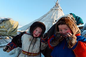 01.03. 2013. Der Autonome Kreis der Jamal-Nenzen. Nomaden-Kinder Xenija und Anton Wajnuto posieren vor dem Tschum, der traditionellen Nenzen-Hütte. Foto: RIA Novosti.