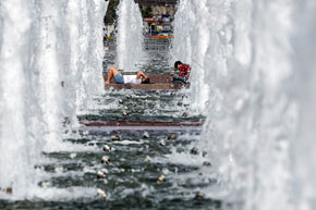 Junge Leute entspannen sich beim Brunnen auf dem Hügel Poklonnaja Gora in Westmoskau. Die Temperatur ìn der russischen Hauptstadt erreichte am Dienstag +31°C. Foto: Grigori Sysojew/RIA Novosti