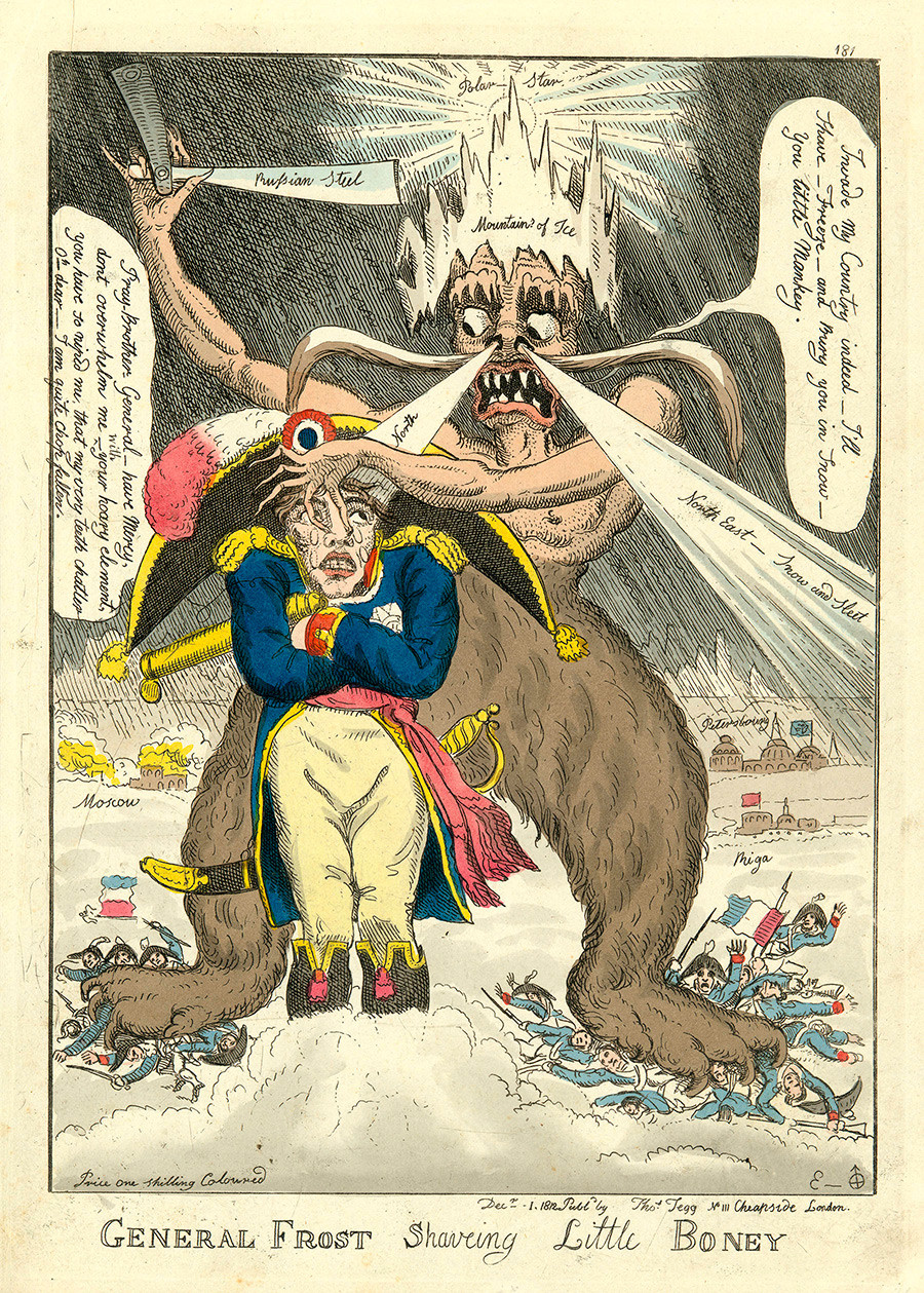 Das erste Mal erschien der Name „General Frost“ 1812 in einem britischen satirischen Cartoon, der dem katastrophalen russischen Feldzug Napoleons gewidmet war. Die jubelnden Briten schrieben: „General Frost rasiert den kleinen Boney.“ Seitdem ist der Name zur Ikone geworden.
