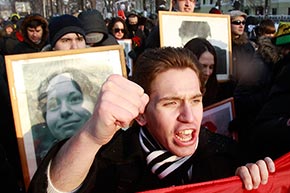 Teilnehmer der Demonstration im Gedenken an den Menschenrechts-Anwalt Stanislaw Markelow und die Journalistin Anastasia Baburowa, die im Jahre 2009 getöten wurden. Foto: Reuters